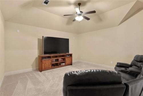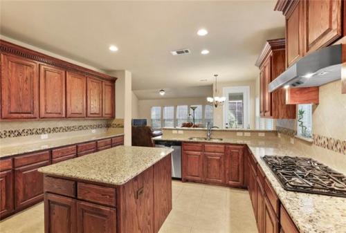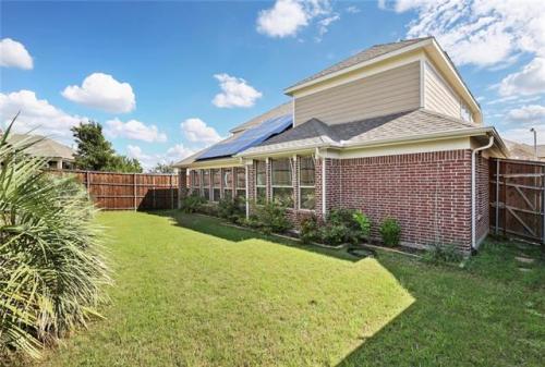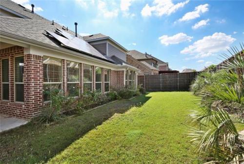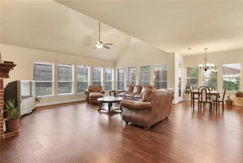 This is an 8-year-old, 3,775-square-feet, south-facing Grand Estates home with four bedrooms and 3.5 baths in Irving, Texas. This energy efficient home features a spiraling wrought iron staircase, hardwood floors, a brick fireplace, vaulted cathedral ceilings, a chef kitchen with island and granite counters, a media room, and a game room. The master bedroom is furnished with granite top vanities. The guest room has its own full bathroom. The house is located in Valley Ranch with convenient shopping and entertainment venues.