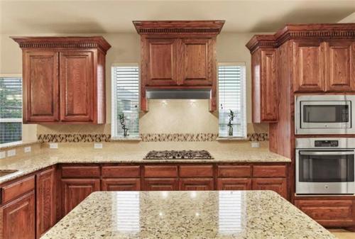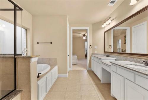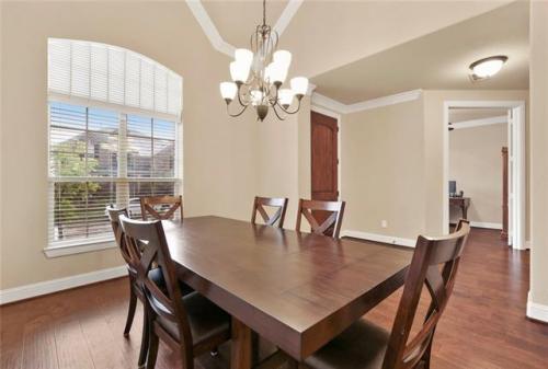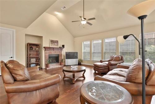 This is an 8-year-old, 3,775-square-feet, south-facing Grand Estates home with four bedrooms and 3.5 baths in Irving, Texas. This energy efficient home features a spiraling wrought iron staircase, hardwood floors, a brick fireplace, vaulted cathedral ceilings, a chef kitchen with island and granite counters, a media room, and a game room. The master bedroom is furnished with granite top vanities. The guest room has its own full bathroom. The house is located in Valley Ranch with convenient shopping and entertainment venues.